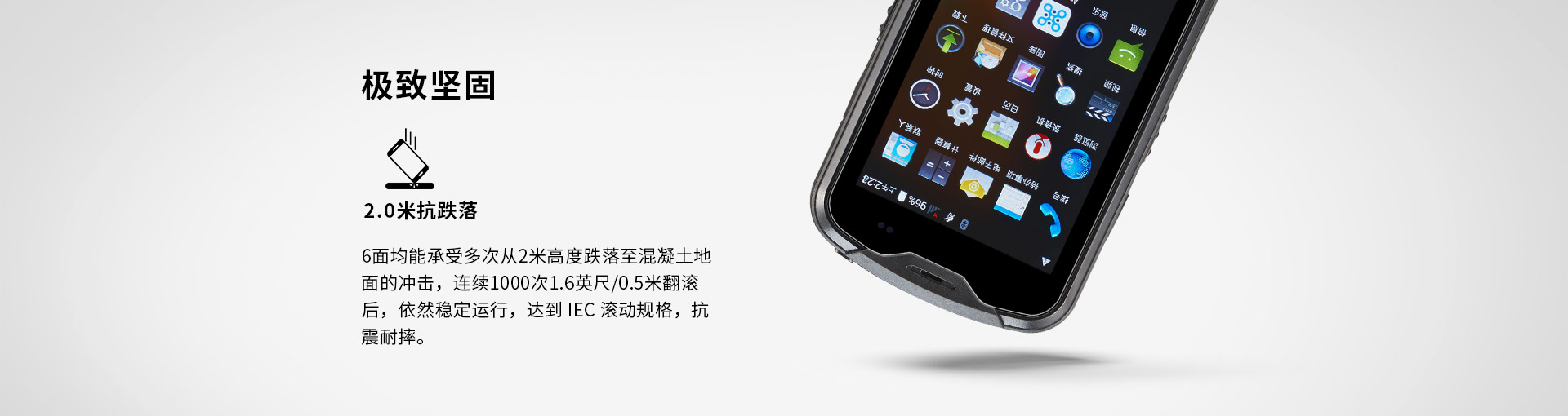 跌落規格在操作溫度范圍內,6面均能承受多次從2米高度跌落至混凝土地面的沖擊